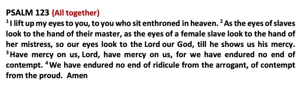 A couple Sundays ago, this was the psalm we said together. I was incredibly moved by the last verses, to be saying them with a group of people who are largely invisible and ignored and who live the reality of this psalm. These are incredibly resilient people, survivors, who faithfully come together every week to lift their eyes to God in the heavens. It’s an honor to be there with them, frankly.